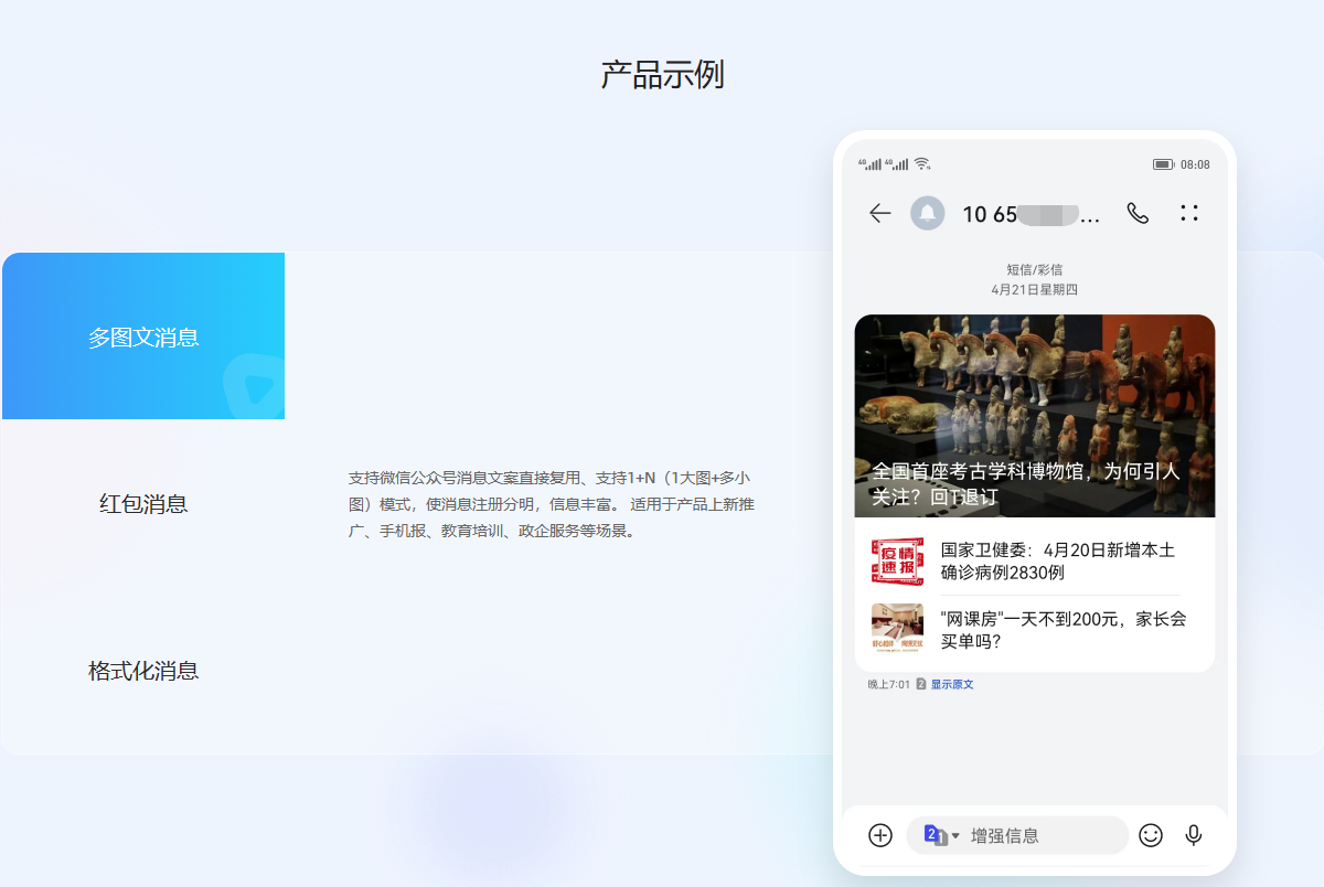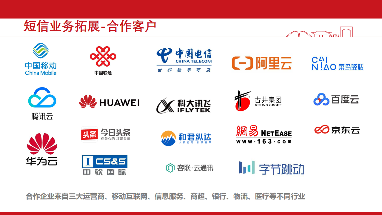 在国内开展、云通信短信业务、多媒体视频短信、5G消息、5G流量、彩信等同时与多家大型企业(阿里、腾讯、华为、科大、百度、美团等)签订电信增值服务类型的合作,业务覆盖面广与生活息息相关,产品类型种类繁多如:验证码收取、业务通知提醒、生活缴费通知、各类商品活动促销通知,信息变更等。