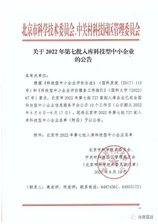 8月19日,北京市科学技术委员会、中关村科技园区管理委员会下发了《关于2022年第七批入库科技型中小企业的公告》,对北京市2022年第七批727家拟入库科技型中小企业通过公示企业名单予以公告。经审核,北京金信瑞通科技股份有限公司榜上有名,成功荣获「科技型中小企业」认定!